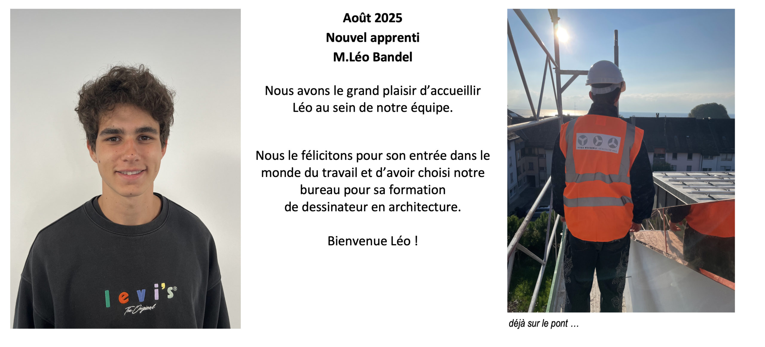 Nous le félicitons pour son entrée dans le monde du travail et d’avoir choisi notre bureau pour sa formation de dessinateur en architecture.